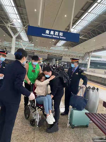 18:10列车到达南昌西站,G78、G79组工作人员将旅客护送至车站救护人员,旅客聂先生一直握着甘剑的手激动着说:“真的是太感谢你们了,感谢你们的专业和用心,没有你们我们真不知怎么办,谢谢了。”