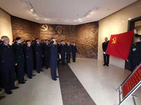 在许光达大将的铜像前,全体党员民警整齐列队,在支部书记、所长肖重仨带领下面对鲜红的党旗,高举右手,庄严宣誓:“我自愿加入中国共产党……”,铿锵有力的誓言,表达了长沙南站派出所全体民警 “对党忠诚、服务人民、执法公正、纪律严明”的决心。誓言字字铿锵有力,句句掷地有声,表达了长沙南站铁警对党、对人民警察事业的无限忠诚与热爱。