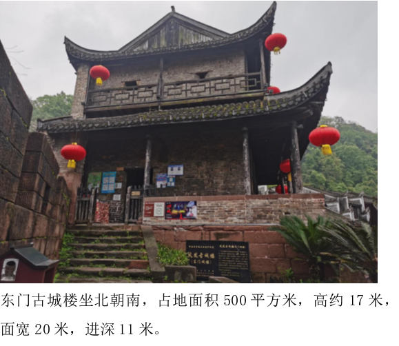 东门城楼由城门和谯楼两部分组成。采用重檐歇山顶式屋顶,穿斗式木构体系,屋顶平缓、有举无折,显得风格高古,端庄大方。城楼滨临柳江,遥对灯台山,登上城楼,可以看到柳江如带,碧波荡漾,群山倒立,桥影绰绰,是访古旅游和观赏古城风光的好去处。