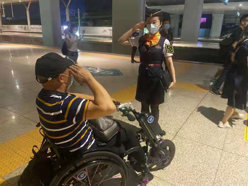 南昌西站到站前,谭梦祯协助吴先生安装好轮椅的前置驱动轮,并与南昌西车站办理交接引导他去出站口。离别时吴先生再次对列车的热心服务表示感谢,但是能够在担当的列车上服务到人民英雄才是她的荣幸,谭梦祯边说边对吴先生敬礼。