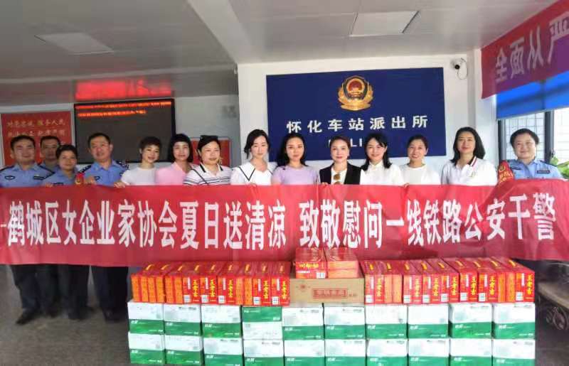 6月24日上午,湖南省怀化市鹤城区女企业家协会人员代表,来到怀化火车站派出所,为奋战在高温一线的民警们送来了防暑降温的矿泉水、凉茶、绿豆等饮用品,对民警辛苦的工作表示慰问。