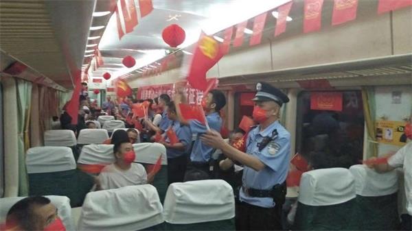 吉首站开车后,列车乘警长蔡凌波和列车长柴建成就和列车员们一起,将两天前就准备好了的庆祝物品拿出来,喜悦地在15号车厢的车顶挂上红色的飘带和红色的灯笼,在车厢两侧的行李架上,则分别拉上悬挂两条红色的横幅“庆祝中国共产党成立100周年”、“青春筑梦心向党,砥砺奋进新征程”,在车厢一端的中间,则由两名乘务员平展开拉着一面鲜红的党旗。