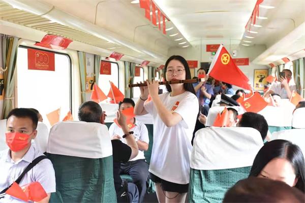 党旗飘扬,歌声响亮,列车上的党团青年和旅客们手摇国旗、党旗,还自发在脸上、额头上贴上了鲜艳的爱国红心,戴上“永远跟党走”字样的红色口罩,青年代表列车员宾其飞唱响《妈妈教我一支歌》,在歌声中拉开序幕。笛声悠扬动听,歌声响彻车厢,党旗随风飘扬,党团青年和旅客代表共同打响《乘上火车游中国《我为祖国守大桥》等快板表演,为日新月异的祖国点赞,声声快板传递党的好声音,青年的正能量,用喜闻乐见的方式讲述党的百年光辉历程。精彩的表演赢得旅客阵阵掌声。列车上党团青年与旅客齐声合唱《没有共产党就没有新中国》歌曲,将现场气氛推向高潮,展现了铁路党团青年的青春风貌,表达了对党和祖国的赤诚情怀。车厢内热情洋溢高昂的歌声,党团青年们以青春之声表达爱国之情、颂党之恩。