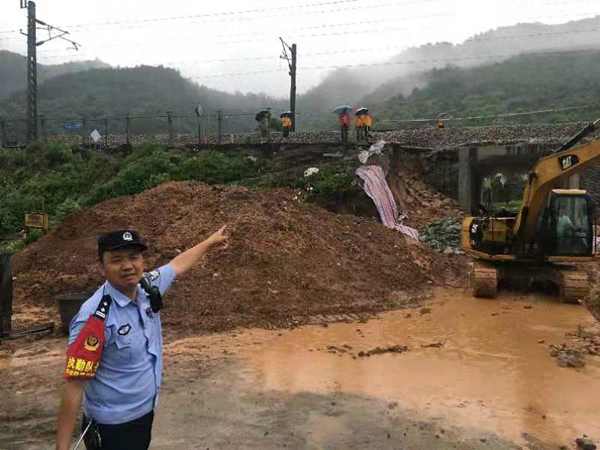 怀化东站派出所民警对准管内线路路基边坡、排水沟、涵洞、周边环境状态,特别对重点防洪重点地段进行了拉网式排查,对发现的防洪隐患问题,及时向铁路相关单位反馈,做到立查立改,及时整治,对无法立即处理的进一步采取安全防护措施,加强日常巡视检查,确保及时发现,妥善处理。同时怀化东站派出所加强与沿线护路队员的联络联动,严格落岗位责任制度,密切关注天气变化,加强雨情、水情、汛情监测,实现预测预报和信息及时共享、应急联动,做好防范应对。确保安全度汛、平稳度汛,全力保障铁路运输生产安全以及人民群众生命财产安全。