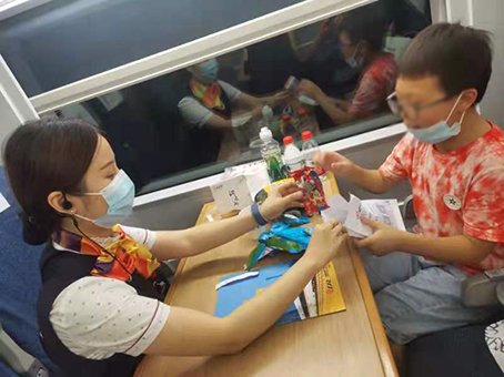 于是,高铁乘务党支部书记、列车长张弦和安全员尤奇立即赶到8号车厢找到了孩子并带其到餐车安排就坐,经了解:小男孩和妈妈是邵阳人,这次是从隆回去长沙看姐姐的,暑运期间客流量大,妈妈独自一人带着孩子去长沙,孩子走在前面先上了车而妈妈却拖着沉重的行李走在后面没赶上车。列车长张弦立即安抚小朋友不要害怕,并与孩子的母亲取得了联系,张车长一边安慰其母亲并建议她改乘后续列车到长沙南与孩子会合,为了平复孩子害怕的情绪,一路上列车上的工作人员也是悉心地照料孩子——列车员朱前和孩子玩折纸游戏、拿出零食、水与孩子分享……在工作人员的努力下,消除小朋友的恐惧心理。