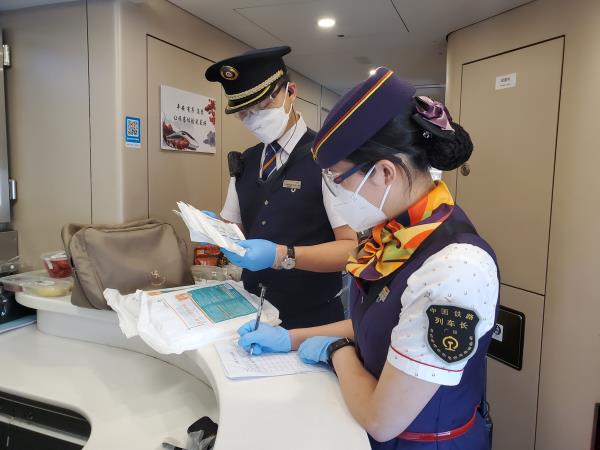 在高铁列车上,车队担当值乘的各班组严格按照高铁动车组列车疫情防控工作制度落实作业标准。按频次和要求做好车内旅客测温,加强车内巡视宣传,提醒未规范佩戴口罩的旅客戴好口罩,劝导旅客尽量减少车内走动和相互交谈。车班还准备了口罩和消毒洗手液,供有需要的旅客免费使用。列车运行途中,值乘人员对旅客使用频率较高的厕所、盥洗室和通过台、过道等重点公共区域以及扶手、门把手、洗脸池水龙头、茶水炉按钮、隔离门开关等重点部位增强消杀次数,随时确保车内卫生达到防疫标准。