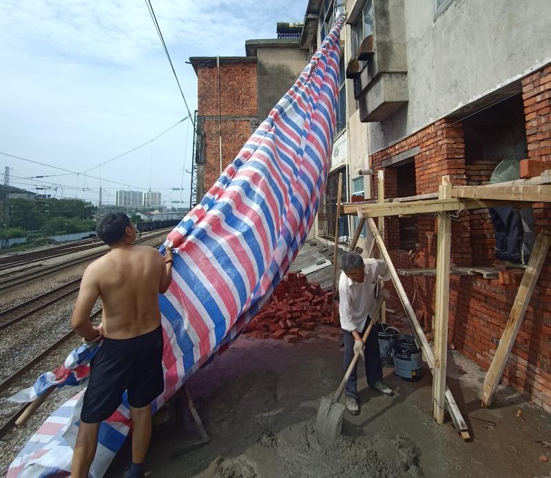 房子外立面搞装修,天气不好怕被雨淋怎么办?岳阳云溪的洪女士想出个“妙招”,从楼顶拉下一大卷彩条布,虽然防了雨可是很可能影响铁路运行,这可不行!铁警提醒:彩条布、防尘网等轻质漂浮物在大风天气极有可能被刮落,导致异物侵限,引起铁路供电故障进而造成列车延误,造成严重后果还将承担法律责任。