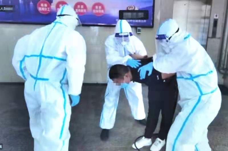 当天,怀化火车站派出所接到报警:车站出口一名“旅客”体温监测达到37.8度,有咳嗽症状,疑似涉疫人员。但这名疑似“涉疫人员”不听指挥,还向工作人员吐口水,在现场无理取闹。为维护车站秩序和防疫公共安全,车站派出所组成控制组迅速上前,使用器械将“涉疫人员”控制,并为其戴上口罩,迅速带离现场。