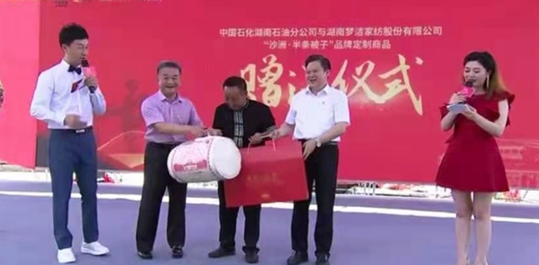 发布会上,中国石化湖南石油分公司与湖南梦洁签订战略合作协议,中国石化湖南石油分公司下属15家分公司签订销售责任状,向“半条被子”故事主人公后人朱小红赠送“半条被子”纪念产品。与会人员还观看了情景剧《半条被子》。