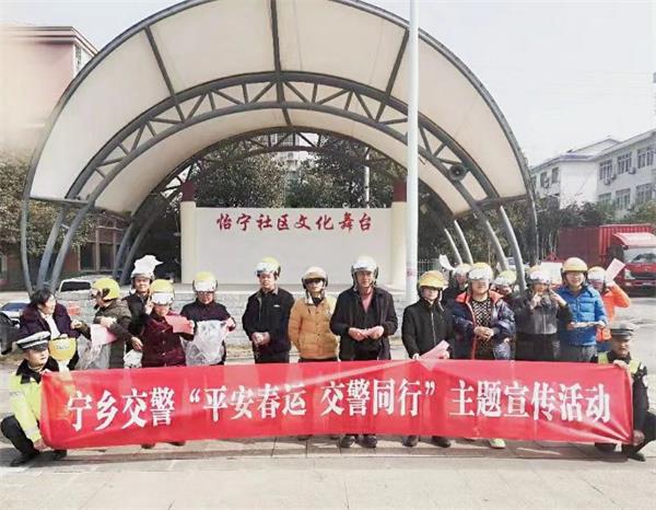 为全力配合春运道路交通安全管理工作,认真开展并切实加强春节期间的道路交通安全宣传工作,宁乡交警根据支队下发文件精神,结合道路交通安全宣传工作实际,兵分两路,联合辖区中队在城郊街道、花明楼镇同步开展以“平安春运,交警同行”为主题,通过悬挂宣传横幅、发放宣传资料、面对面答疑、赠送安全头盔等方式开展宣传活动,切实提高了广大人民群众的交通安全意识,为平安中国年创造了良好的道路交通安全宣传氛围。