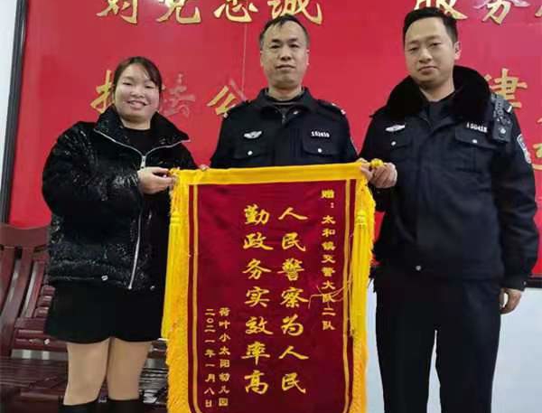 1月28日下午13点20分,桂阳交警大队太和中队邓祖辉、曾超、尹有禄等三人在省道S215线荷叶炭灶村路段出警时,发现一个4岁左右的小男孩独自行走在马路上,旁边是川流不息的车流。三人立即下车询问,小男孩因为心里恐惧一直不敢说话,为了安全,大家只好先把他带上警车进行安抚,又在路旁小店买了零食给他吃。通过近两个小时的相处沟通引导,终于得知了他在荷叶小太阳幼儿园就读,又通过幼儿园查询到小男孩的家庭信息和地址,几经转辗,民警们才将孩子送到了爷爷奶奶手上,原来小男孩是留守儿童,当天跟爷爷去赶圩时走丢。第二天,为了感谢交警的热心帮助,家属和荷叶小太阳幼儿园特意送来了锦旗,以表谢意。