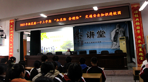 宣讲民警、辅警针对中小学生的不同需求和情况,精心组织了课件,在桃花源一中,结合中学生交通违法行为特点、联系生活实际,民警通过视频案例和近年来该学校学生发生的交通事故案例进行了讲解,警示同学们要自觉做到未满18周岁不乘坐无牌、超载的电动三四轮车、摩托车、电动车等危险的交通工具。提醒同学们出校门后走路时不看书、不打闹、不玩手机、不玩滑板等危险行为,要争做一名合格的交通安全宣传员,提醒父母在接送时要做到文明出行,有序规范停车等,共同维护好学校护学岗工作。