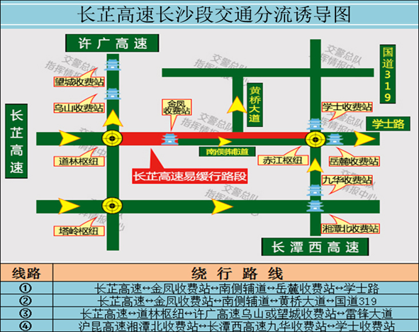 东往西绕行建议:金洲大道→经白箬铺收费站→转许广高速→转道林枢纽。西往东绕行建议:一是长芷高速→金凤收费站→南侧辅道→岳麓收费站→学士路。二是长芷高速→金凤收费站→南侧辅道→黄桥大道→国道319。三是长芷高速→道林枢纽→许广高速乌山收费站或望城收费站→雷锋大道。四是沪昆高速湘潭北收费站→长潭西高速九华收费站→学士收费站。