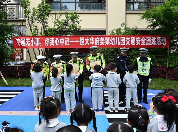 为进一步提高交通安全参与者的安全意识,让孩子们从小能养成遵守交通法规的好习惯,4月27日,常德公安交警直属四大队特勤中队中队长黄琦带队走进辖区常德市恒大华府姜莱幼儿园,开展“交通无小事,你我心中记”交通安全演练活动,向幼儿园师生宣传交通安全知识。
