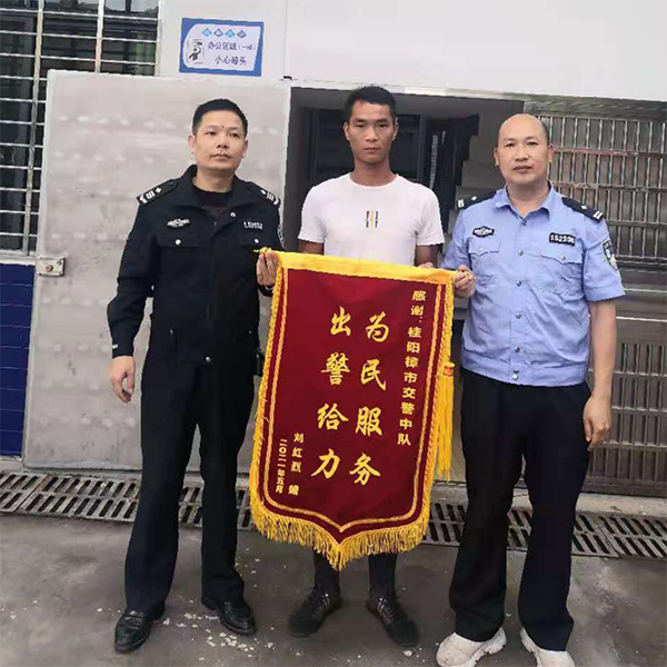 无独有偶,5月17日上午11时,一名年轻男子刘某来到桂阳交警大队樟市中队,神情激动,哽咽的说:“搭帮你们交警,让我一家人有安全保障,我才能在外安心工作!”,并送上一面“为民服务、出警给力”的锦旗表示感谢。事情的原委是这样的:4月30日早上,一老太太行走在樟市镇瓦僚村小路上,一辆三轮摩托车突然从路上穿过,撞倒了老太太后逃之夭夭。多亏其他村民发现,拨通了报警电话。接警后的樟市中队值班民警刘亚雄迅速出警赶到事发现场,联合医务人员及时将老人送往医院救治才使老人脱离危险。因老人儿子远在贵州打工未能及时赶回,刘亚雄等办案民警时刻关注老人身体情况跟精神状态,不时到医院探望慰问,直到家属赶回照看。同时,刘亚雄等办案人员克服了车子是无牌照车辆。又没有其他明显线索等困难,转进走访周边村镇一遍遍排查,快速锁定肇事司机,并抓捕归案。老人的儿子等亲属非常感激交警的工作,以及对老太太的关心,才有了送锦旗一幕。