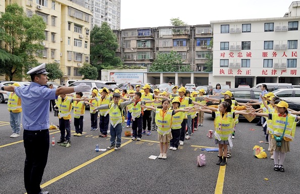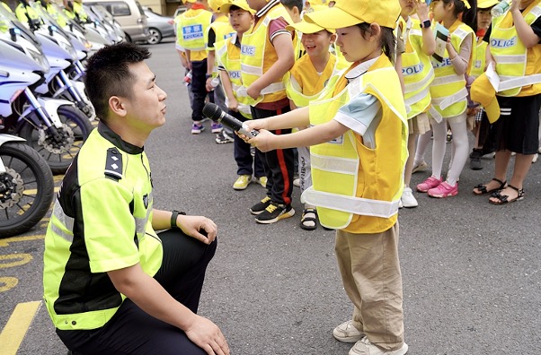 在体验中,雷浩还一一向小记者们介绍了酒精测试仪、警棍、反光背心、执法记录仪等警用装备的具体功能,并手把手地教大家停止、直行、左转弯、右转弯等交通指挥手势。其中,5名小记者来到市委路口充当“小交警”,对过往车辆途径斑马线进行停止让行指示以及对行人进行护送。通过“角色扮演”,使小朋友们的交通安全意识得到了更深层次的巩固和加强。