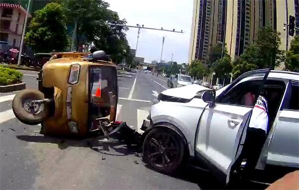 路口公共视频监控显示,当天上午10时30分,在常德市城区长庚路与高泗路交汇处,一辆牌号为湘J090LE的三轮摩托车沿长庚路由北向南行驶至与高泗路交汇处时闯红灯,撞上沿高泗路由西向东正常行驶的牌号为湘JA515W的小车。事故造成三轮摩托车侧翻,两车不同程度受损,小车乘客因车辆急刹车造成腿部皮外轻微擦伤。