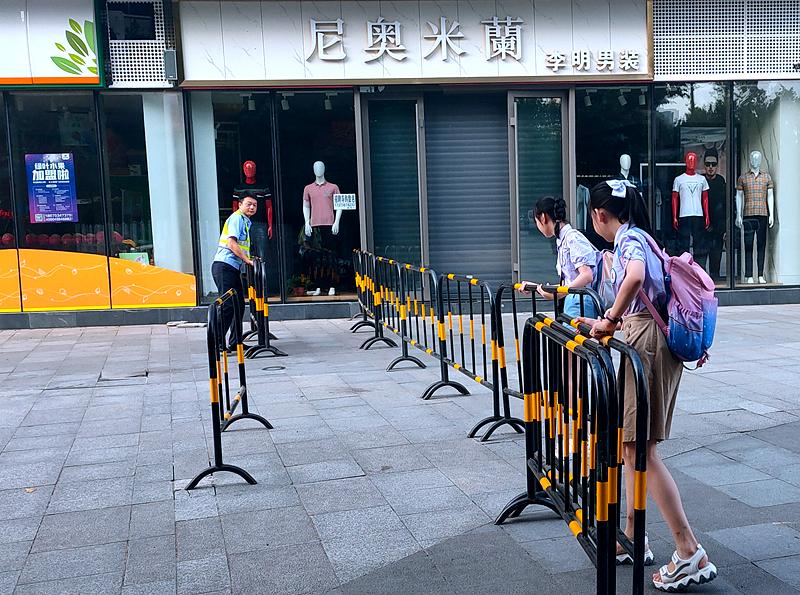6月8日,高考第二天早上,常德公安交警直属一大队民警辅警正在常德市七中考点周边的人民西路设置路障,实行交通管制。两位身穿校服的小学生主动到高考考点帮忙。