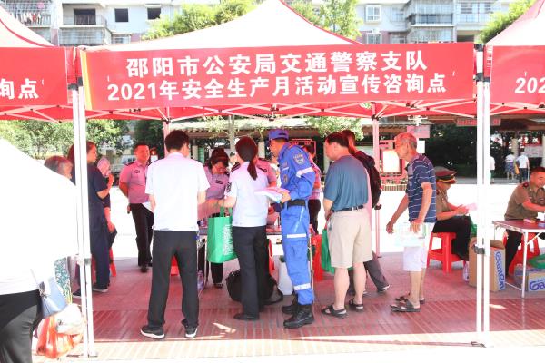 6月16日,由市政府、市安委会主办的邵阳市2021年“安全生产月”集中宣传咨询日暨安全生产工伤预防和“专项整治攻坚战”主题宣传活动在市区西苑公园举行。市领导彭华松、刘德胜、沈志定出席活动,邵阳市公安局交警支队积极组织民警参加,扎实推进安全宣传月活动。
