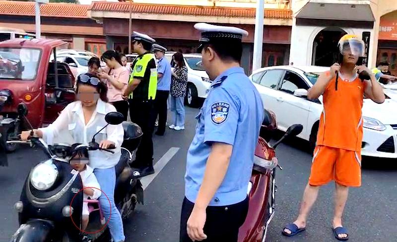 6月23日上午,常德公安交警直属一大队五中队在常德城区武陵阁附近开展摩托车、电动自行车专项整治行动。这时,一辆黑色电动自行车驾驶人未佩戴安全头盔缓缓向执勤民警驶来,执勤民警当即拦下该车进行检查。当民警靠近该车后,低头一看,竟然在车辆踏板上发现还有一个3-4岁大的宝宝坐在家长自行放置的小板凳上面,摇摇晃晃危险万分。“小板凳没有固定,一旦遇到紧急刹车等情况,孩子就会被甩出酿成事故。这样带孩子十分危险!你知道吗?”执勤民警立即向驾驶人指出安全隐患,现场对电动自行车驾驶人进行了法制宣传教育,告知其危险性,并要求驾驶人立即纠正不安全行为。