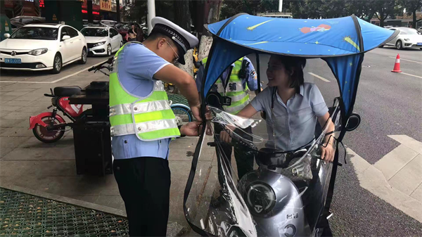 民警查处非法加装遮阳伞具和不戴头盔行为
