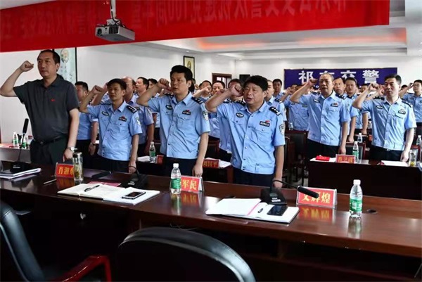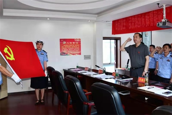6月29日上午9时30分,根据活动方案安排,祁东公安交警全体党员民警、职工在大队党总支部书记肖湘东同志的带领下,共同唱响国歌,并面向党旗,重温入党誓词。