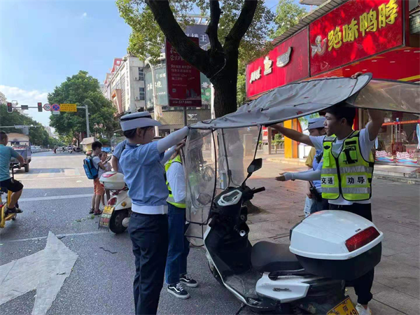 整治行动中,执勤人员对摩托车、电动车驾驶员进行耐心的劝导教育,告诫摩托车、电动车驾驶员“加蓬、打伞”易造成视线受阻,行驶不便,且受风力影响较大,易致车辆失去重心发生侧翻引发交通事故,让他们认识非法安装遮阳伞(雨棚)存在的安全隐患会给他人和自己带来危害,引导其自觉遵守交通法规,提高驾驶人文明交通、安全防护意识。