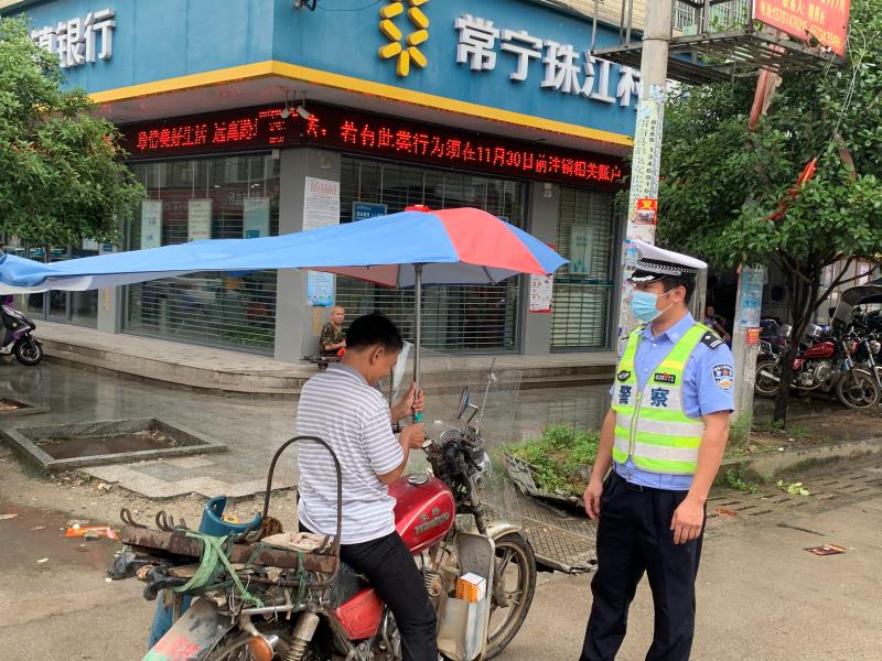 8月7日,常宁市西岭镇逢集,一男子骑着摩托车刚行驶到街口就被在此设卡的西岭交警中队执勤人员拦停并当场拆除私自加装的遮阳棚。此次行动的开展,标志着常宁市公安交警部门在积极做好疫情防控的同时,继续对摩托车、电动车进行严厉整治,防止交通违法出现反弹。