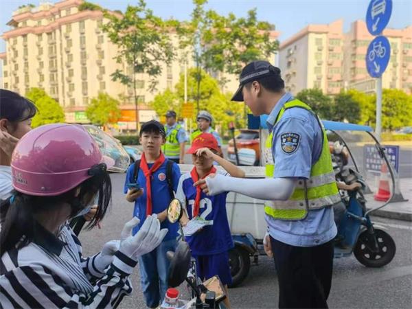 8月2日,北塔交警结合“一盔一带”、“知危险、会避险,安全文明出行”宣传主题,再次组织湘郡铭志学校20多名学生组成文明交通小志愿者宣讲队,上路开展交通安全宣传活动,在宣传民警组织大家集中学习交通安全知识以及上街体验交警工作需注意事项后,小志愿者们就身穿红色背心,手拿指挥旗在民警的带领下来到了江北广场的4个执勤路口开展劝导。“叔叔,你没戴安全头盔。”劝导活动中,一名男子驾驶着电动自行车搭乘一人被小志愿者用稚嫩有力的童声喝止,并告诉车后座的乘车人员应戴好头盔安全乘车,需要佩戴安全头盔。男子流露出尴尬的笑容,随即表示在以后的日常中一定注意,遵守交通法规,然后在小志愿者的微笑目送下离开。同时小志愿者们还向过往的电动车驾乘人发放宣传手册,提醒电动自行车驾乘人员保护自身安全,文明规范出行。