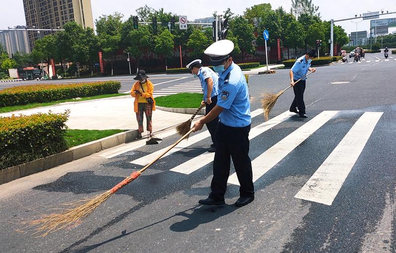四名辅警午休时间顶烈日清扫马路的为民举动,赢得了过往司机和市民群众纷纷点赞。
