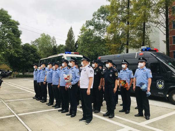 警灯闪烁,英雄归来。当天上午9点30分,全体骑警庄严列队,在秋风中夹道迎接援张抗疫突击队。为圆满完成此项光荣任务,州、市公安局高度重视,要求所有人员按照“战时状态、战时要求、战时纪律”,以“最高礼遇、最深敬意、最佳形象”护送公安干警至集中隔离点休养,并做好车辆沿途值守警卫工作,维护周边交通和治安秩序,用最高礼遇向抗疫英雄表达敬意。