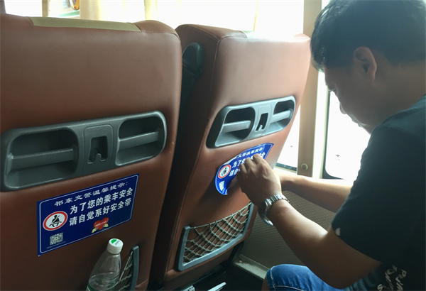 为防范化解客货运重点车辆安全风险,坚决遏制相关群死群伤交通事故,县交警大队印制了安全带使用提示贴,上面印有醒目的“为了您的乘车安全,请自觉系好安全带”字样,在全县975台客运车辆(包括校车),30000个座位上统一张贴。