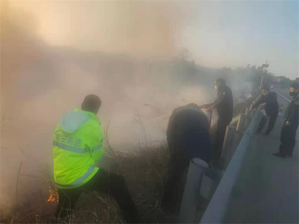 面对险情,长塘养护所巡查人员分工协作。一方面迅速拨打119火灾报警电话并将现场情况上报路网分中心、公司值班领导以及路段联勤联动相关单位,另一方面立即拉响巡逻车警报、摆放反光锥筒、设置警示区,并在现场指挥交通,提醒过往车辆减速慢行、注意安全,同时利用巡逻车上携带的干粉灭火器进行灭火,防止火势蔓延至监控设备处,为后续的相关单位扑灭火情打下了基础。