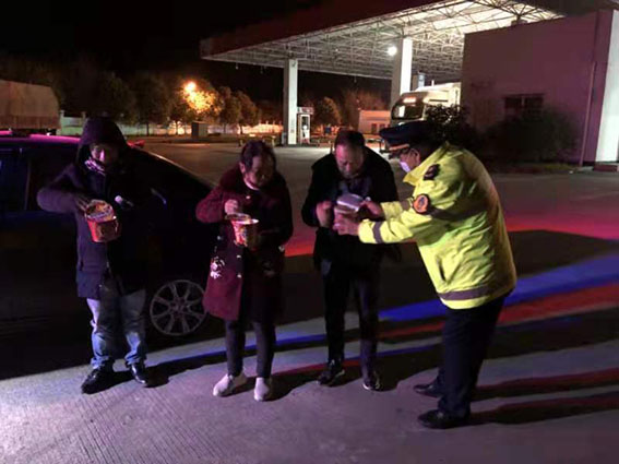 00时50分,故障车辆跟司乘人员到达冷水滩服务区,路产管理人员变身“高速外卖员”把泡好的“”板蓝根”跟方便面送到了司乘人员手中,司乘人员连忙表示感谢,杨大勇表示这都是我们应该做的,随即带领路产队员继续投入到抗冰保畅的战役中。