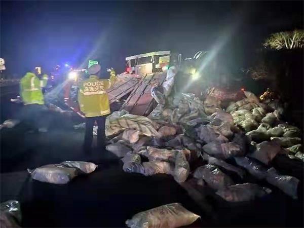 情况紧急,路管员立即打开报警灯,对现场做好安全维护,并将情况通知养护部门及施救队。由于货物散落在行车道影响了过往车辆,路管员在保证安全的情况下,立即拎起货物,协助养护人员,一袋袋的往外搬,避免二次事故的发生。正月的夜晚寒风刺骨,此时气温接近零度,路管员顶着恶劣天气,迅速把散落在车道的货物清除完毕。由于天黑能见度很低,车流量较大,路警商议后,出于安全因素考虑决定天亮后再进行清障施救,并在事故现场摆放好安全锥桶,摆放施救车辆示警,保证了事故现场安全。
