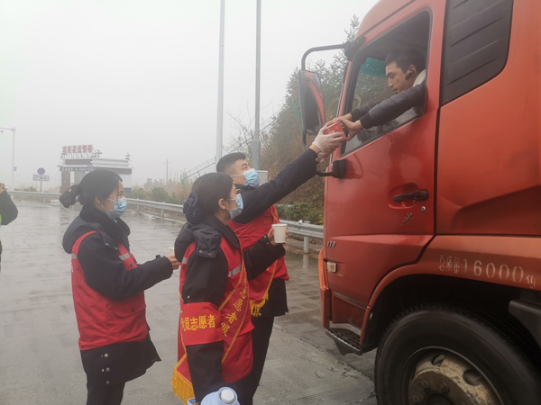 尽管下着毛毛细雨,但志愿者们依旧不减热情地为过往的司乘人员提供一杯杯御寒姜茶、一次性口罩、方便面八宝粥、简易维修工具、发放疫情防控指南以及实时路况咨询等便民服务,提醒司乘人员佩戴口罩,引导他们学做好自身防范。