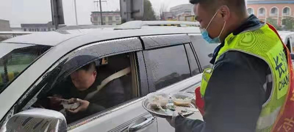 “师傅,今天过年,我们请您吃饺子!”志愿者们虽然带着口罩,眼角上扬的微笑,司乘人员肯定感受得到。