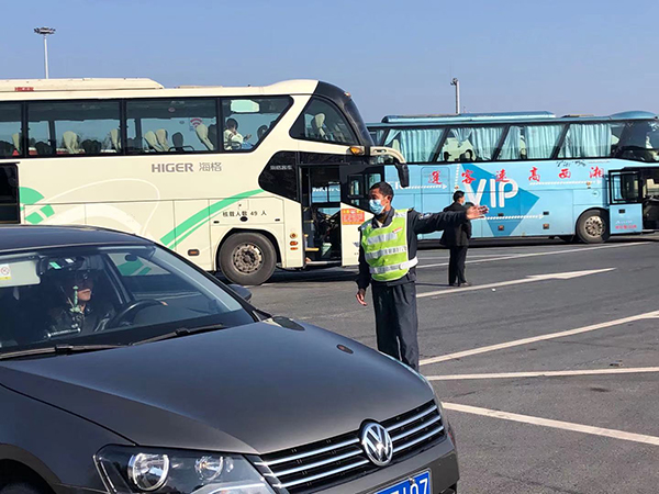 在桃花源服务区广场内,一些穿着橙绿色保洁衣、戴着口罩的清洁工正低伏着身子,一手拿着扫帚,一手提着铲子,不停地穿梭在停车区车辆之中,积极地做好春节期间桃花源服务区卫生清理工作,忙碌的身影成为高速服务区另一个靓丽风景线。