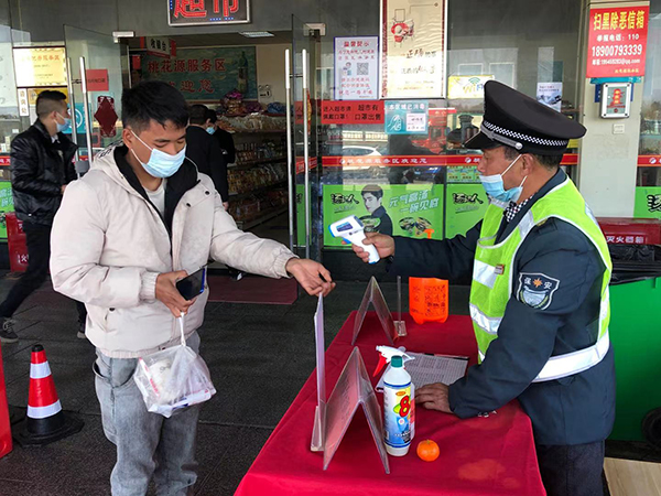 在桃花源服务区大厅,我们又发现LED屏滚动播放防疫宣传标语、制作张贴疫情防控宣传,关闭人流密集区餐厅、超市、小吃店原有的路口,仅保留一个主出入口,设警戒线,入口处设置健康码核验和体温检测服务台,司乘人员经过体温检测区,由工作人员进行测温和健康码核验,对未佩戴口罩的司乘人员免费发放口罩,并做好人员出入登记。