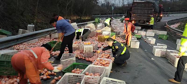 23时30分,经过近5小时的奋斗,散落的脐橙基本装车完毕,现场也被清理干净,道路恢复通行。