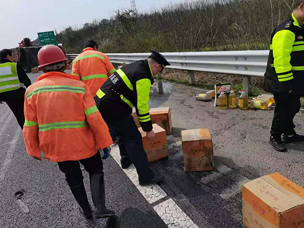到达现场后,路管员发现一辆装载菜籽油牌照为湘J的仓珊式小货车侧翻在公路路面,车内一箱箱的菜籽油散落一地,占用了行车道和应急车道,现场只有超车道能缓慢通行,严重影响道路正常通行,所幸无人员伤亡。路管员迅速展开救援工作,摆放安全锥型筒,配合高速交警疏导交通,维护现场通行秩序,并对事故现场进行勘察。由于小货车装载满车一箱箱的菜籽油共计300箱价值6万多元,现在多半散落在地,急需要转运和及时清理。为尽量将司机的损失降到最低,路管员与养护人员当起了“搬运工”与“清洁工”,将洒落路上菜籽油逐箱、逐瓶搬至高速公路路基旁。15时,事故车辆拖离现场,路面清理干净,道路交通秩序完全恢复正常。由于处理及时,措施得当,该事故未造成高速公路拥堵,也为车主挽回了经济损失。经了解,小货车因车速过快,为避免与前面的大货车追尾,驾驶员避让不及操作失误反打方向盘,才导致车辆侧翻。
