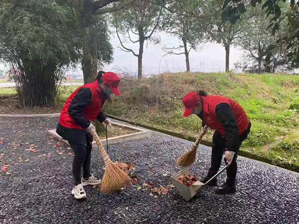 参观活动结束后,志愿者们为故居草坪拔除杂草和清扫地面上的落叶。经过近一个小时的清扫,草坪和长廊更加整洁干净,一个个“红”色身影,用自己的实际行动向老一辈革命家致以崇高的敬意。