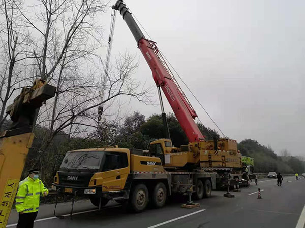 由于现场情况复杂,救援难度较大,有可能会出现路面车辆拥堵等现象。现场值班领导立即向分公司值班室报告。13时左右,长沙分公司值班领导党委书记、总经理谭绍富赶赴到现场,根据现场救援情况,再次科学调整救援力量后,事故车辆被顺利地从边坡吊到公路上。