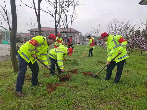 3月11日下午,乌山党支部、白箬铺党支部党员干部与望城交警大队干警齐聚望城收费站,组织了简短的植树活动启动仪式。大家手拿工具,统一列队,整齐站立在提前准备好的树苗前,非常有仪式感。随着一声令下,大家迅速展开行动,你挖坑、我刨土、他搬树,相互协作配合,干得热火朝天。
