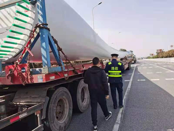 3月22日,长潭路产大队路管员胡杨、彭卓一早就赶到辖区内马家河收费站入口,发现已有三辆大件运输车辆整装待发。路管员当即开展核查工作,通过扫码验证《超限运输车辆通行证》,并实地测量该车货总长54米,总宽3.6米,总高4.80米,经核查确定,该三辆大件运输车属三类大件运输车辆,拟从湖南启运,途径湖南省、湖北省、河南省、河北省,最终到达内蒙古自治区,是通过湖南省交通运输厅超限运输车辆审批发证,运送风电设备叶片的大件运输车辆。现场一前一后还停放有两辆护送车辆,经认真核对与通行证护送方案上护送车辆一致,并配备了警示灯及高功率喊话器、对讲机等安全警示设备,符合相关要求和标准。待逐一核验完毕,路管员对即将驶入高速的超限车辆告之相关护送规定及事项,要求护送车辆必须严格按照办证审批护送方案进行全程护送,至此,对该三辆大件运输车辆的现场核查工作结束。