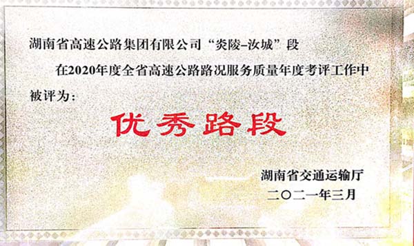 3月26日,湖南省交通运输厅召开2020年度全省高速公路路况服务质量考评结果通报会,会上,湖南省高速公路集团有限公司郴州分公司炎陵-汝城、桂阳-临武获评“优秀路段”荣誉称号,这充分体现了省交通运输厅对郴州分公司道路养护工作的肯定。