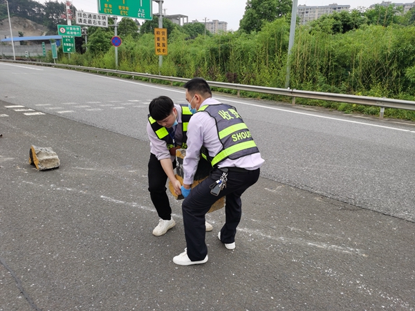 为避免二次事故,毛康伟迅速把锥桶摆到事故车辆前方,并呼叫监控室向高速交警报警,录制好现场视频、拍好照片进行留存。随后,毛康伟同赶来现场的同事申烨和赵益军一起把洒落在广场中间的栏杆、水泥墩进行清理,确保其他车辆安全通行。