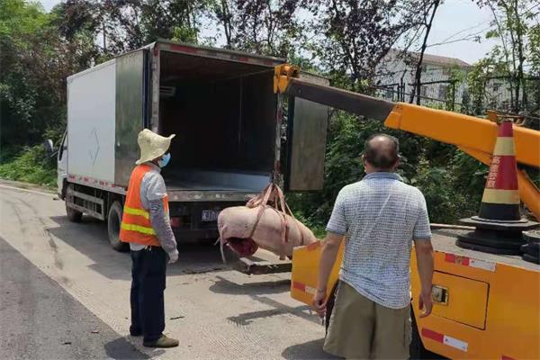 2021年6月7日11时,湖南高速常德分公司河洑路产大队在日常巡查至G56杭瑞常德段K1009+200西往东往长沙方向,发现右侧应急停车港湾内横躺着两头死猪。非洲猪瘟病毒已在全国形成一定污染面,且天气炎热,若不及时处理,死猪很快会腐烂,有传播病疫的危险!路管队员不敢擅自搬运清理,立即向大队领导汇报具体情况,根据指示,对现场做好安全措施,摆放锥桶,并通知桃源县畜牧水产局到现场进行专业检查处理。 13时,桃源县畜牧水产局工作人员赶到现场,向河洑路产大队路管员了解情况后,开始进行处理。通过初步检验,畜牧水产局工作人员推测这两头猪应是在运输过程中不耐高温而被热死的,随后便被猪贩遗弃在高速公路上。现场经过畜牧水产局工作人员处置后,救援人员开始用清障车吊臂缓缓吊起一头被五花大绑的大猪,随着吊臂起吊,在空中摇摇晃晃,不到半个小时,两头猪就被吊装放进了箱式小货车内,死猪清理完毕,河洑养护人员再次对港湾喷洒消毒液,确保安全。
