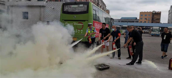 演练场地二:“叮铃铃”,刺耳的警铃响起,车站特情应急救援中心值班员接到紧急呼救电话:汽车维修车间员工操作不当引发火灾,请求支援。火情就是命令,站场特情应急救援小组成员迅速跑向站区灭火器安放点,操起灭火器材快速向火灾突发点集结,紧急疏散工作区域人员,判定风向,找准火源起点准确喷发,随着灭火器喷出的黄龙,冲天大火瞬间被压制,熄灭之处只看到缕缕青烟,火情消除。