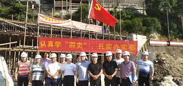 6月22日,中共安化县交通工程公司党支部一行肩扛党旗、戴着党徽、拉着横幅,再次来到了“党建引领”、“学党史办事”示范工程柘溪镇广益小桥建设工地,实地查看项目建设进展情况。